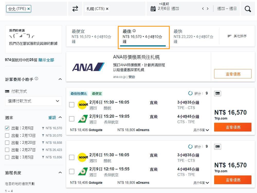 |完成札幌機票比價動作,並進行預訂